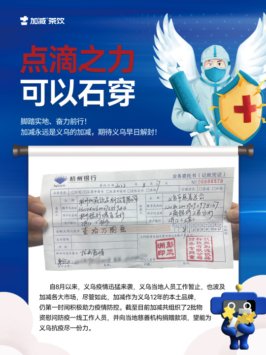 2022年8月11月,因义乌突如其来的疫情,整座城市按下了暂停键,全民进入静默期。在这场新冠肺炎疫情爆发期间,作为深耕义乌发展12年的凯发K8茶饮,主动发扬本土企业的社会担当和责任。截至2022年8月17日,公司共组织了2批物资慰问一线人员,并向当地慈善机构捐赠爱心款项。脚踏实地、奋力前行!凯发K8以实际行动为打赢疫情防控战贡献力量!